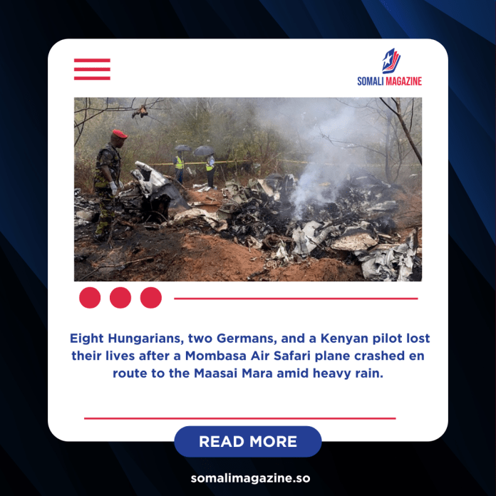 A tragic plane crash in Kenya’s coastal region of Kwale killed 11 people early Tuesday morning, most of them foreign tourists traveling to the Maasai Mara National Reserve. The aircraft, operated by Mombasa Air Safari, went down in a hilly and forested area roughly 40 kilometers from Diani airstrip. Authorities said the accident occurred around 5:30 a.m. local time amid heavy rainfall along the coast.