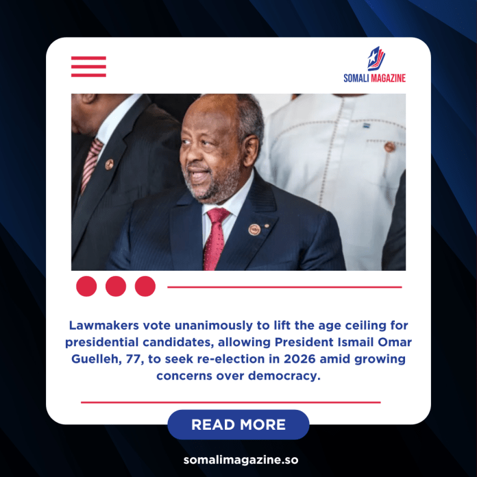 Djibouti’s parliament has voted to remove the constitutional age limit for presidential candidates, clearing the way for President Ismail Omar Guelleh, 77, to run for a sixth term in office. All 65 lawmakers present supported the amendment, which eliminates the previous age cap of 75 years. The change still requires either approval from the president followed by a second parliamentary vote on November 2 or a national referendum before it becomes law.