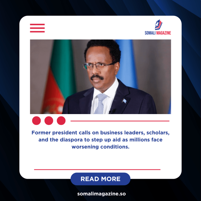Former Somali President Mohamed Abdullahi Farmaajo has issued a renewed call for Somali business leaders, religious scholars, and community members to increase their support for families affected by the ongoing drought, as humanitarian needs continue to grow across the country. In a statement released on Wednesday, Farmaajo said thousands of vulnerable households have gone two years without receiving adequate aid, leaving them in increasingly desperate conditions. He emphasized that many communities, especially those in rural and hard-to-reach areas, are struggling to cope after consecutive failed rainy seasons, which have destroyed crops, killed livestock, and weakened traditional coping systems that families rely on during difficult times.