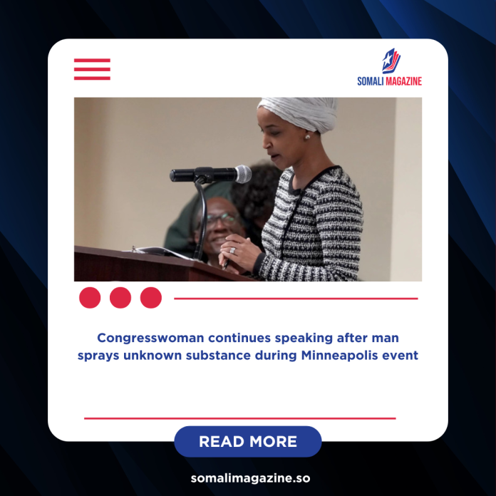 A man sprayed an unknown substance at Democratic U.S. Representative Ilhan Omar during a town hall meeting in Minneapolis on Tuesday, prompting security and members of the audience to tackle him to the ground. The incident happened amid heightened tensions in the city over federal immigration enforcement and recent fatal shootings involving immigration agents.