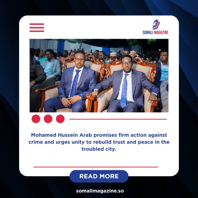 During a handover ceremony attended by officials, elders, and community members, Governor Mohamed — widely known as Mohamed Hussein Arab — received the leadership mantle from outgoing governor Muse Salad Wehliye. In his speech, he said his top priority would be ending the wave of crime, armed robberies, and killings that have left residents living in fear.