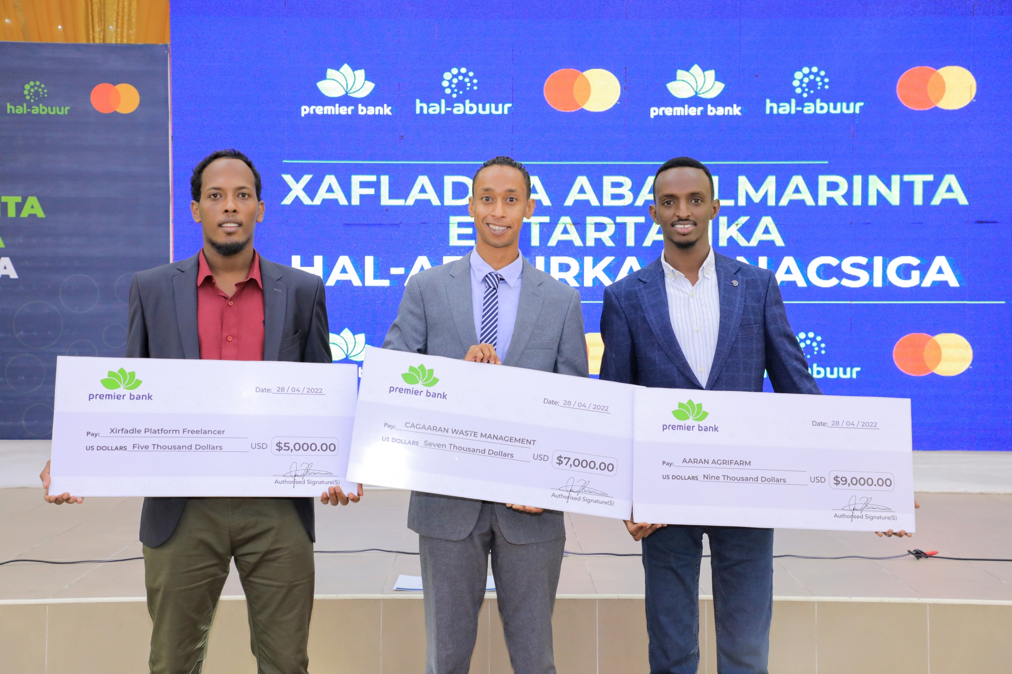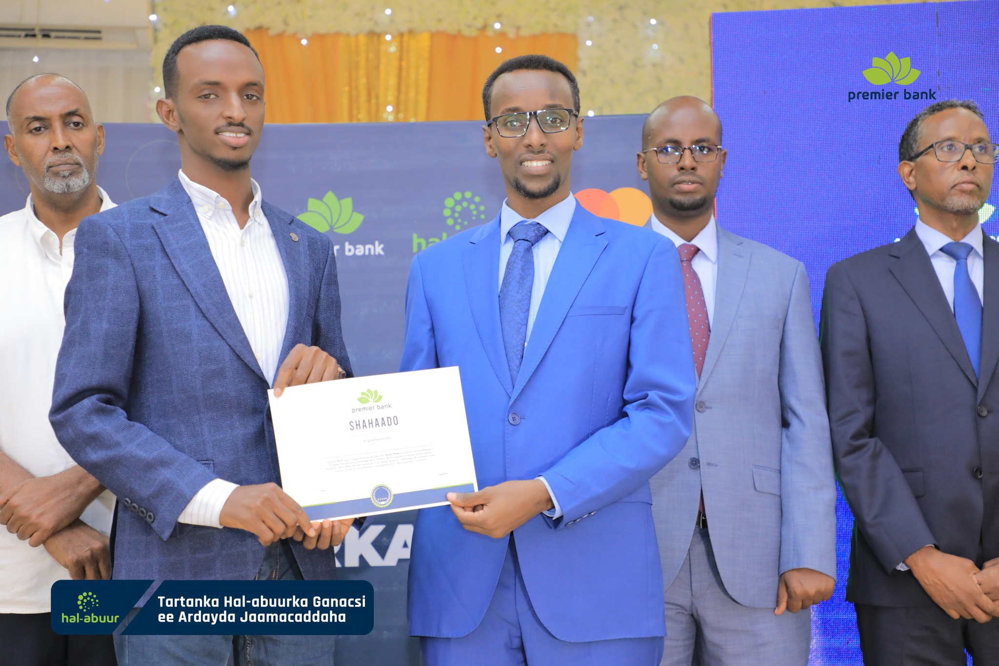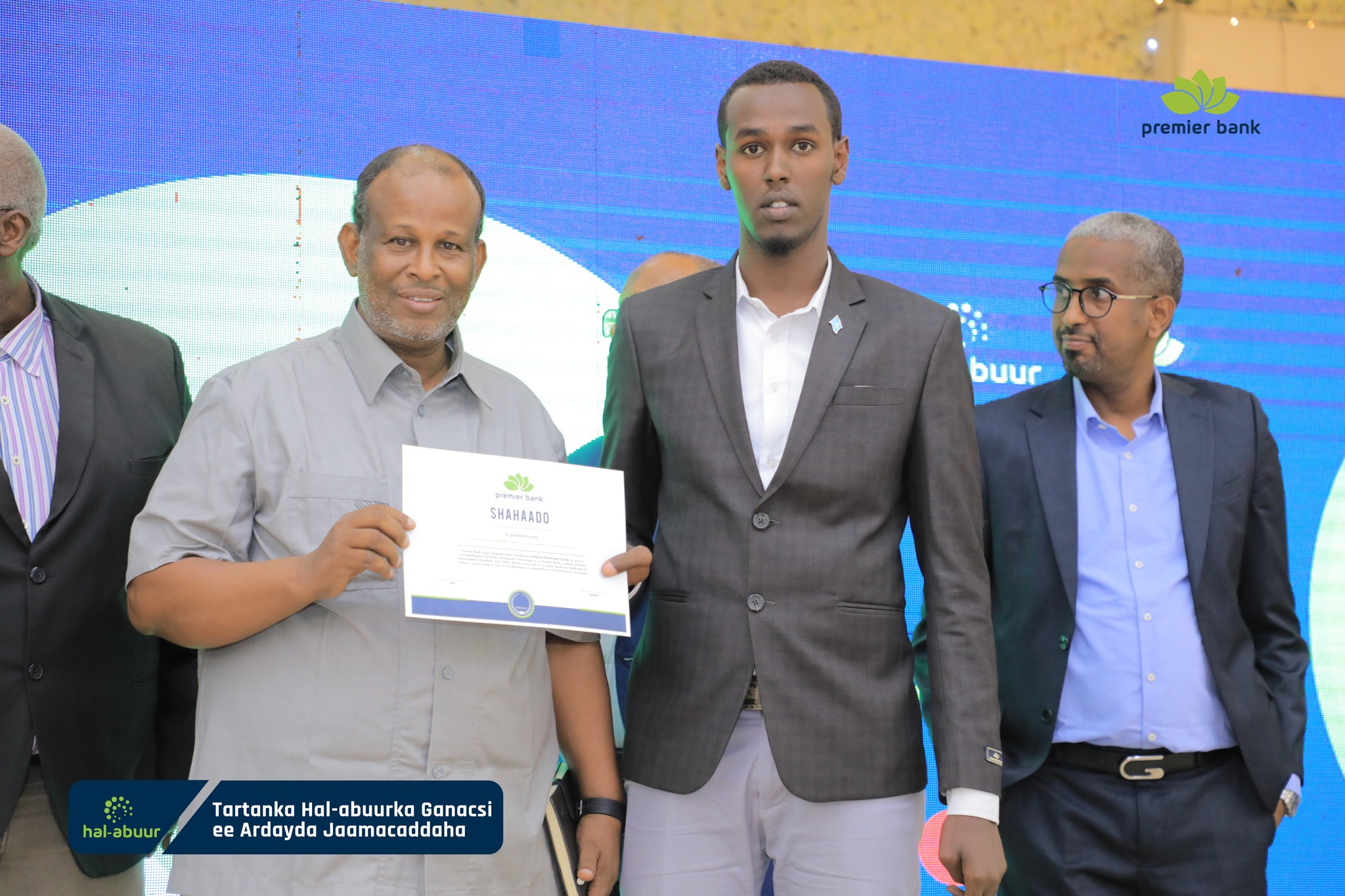 Premier Bank of Somalia held an award ceremony in Mogadishu last night, giving a cash prize of $21,000 to the top three students of the Hal-abuur startup competition, which was held for the first time in Mogadishu this year for the talented and creative university students.
