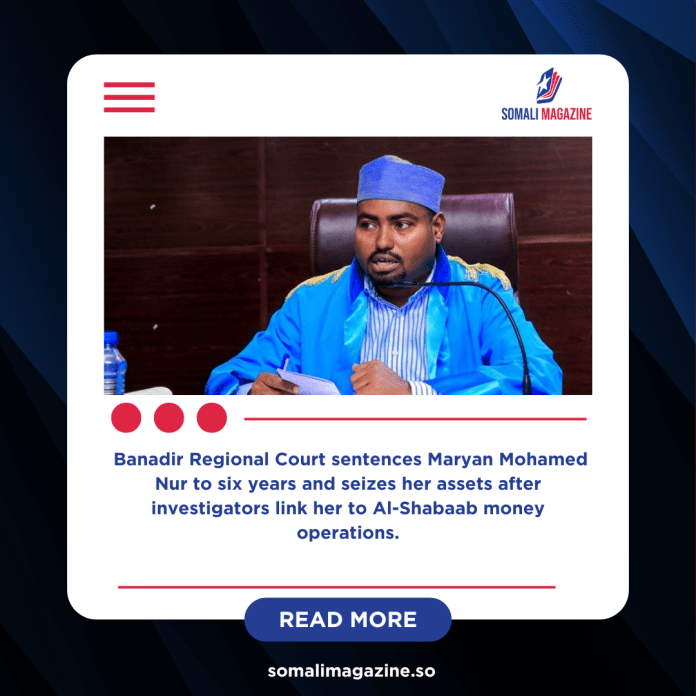 The Banadir Regional Court has sentenced a woman identified as Maryan Mohamed Nur to six years in prison after she was found guilty of financing terrorism, laundering money, and helping channel large sums of cash to the Al-Shabaab insurgency. The ruling, delivered this week in Mogadishu, follows months of investigations by the Office of the Attorney General, which accused Maryan of running a network of bank accounts and mobile numbers used to move more than two million dollars for criminal activities.
