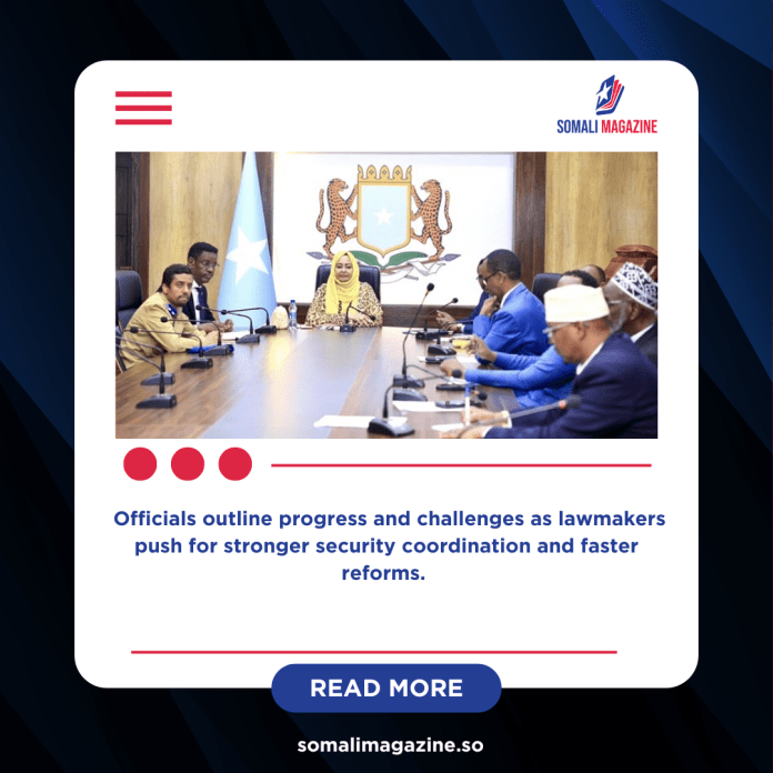 Somalia’s internal security minister and the country’s police chief met with members of the national parliament on Sunday to provide a detailed update on the country’s security situation and answer questions from lawmakers. The meeting, held at Villa Hargeisa, brought together Internal Security Minister Abdullahi Sheikh Ismail, widely known as Fartaag, and Somali Police Force Commander General Asad Osman Abdullahi. They appeared before the Lower House committee responsible for internal affairs, regional administration, and national security, chaired by MP Fowsiyo Mohamed Sheikh.