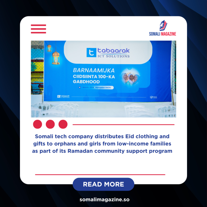 Somali technology company Tabaarak ICT held a community support event in Mogadishu on Sunday, where 100 girls from orphaned and low-income families received Eid clothing and gifts ahead of the upcoming holiday. The initiative was organized to help the children celebrate Eid with joy and dignity while easing the burden on families who may struggle to afford holiday preparations.